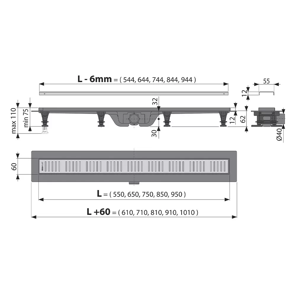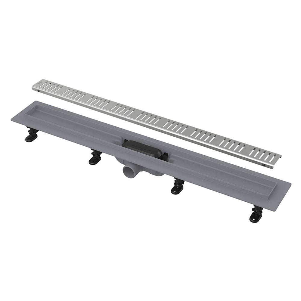 AlcaPlast Tuš kanalice APZ10 sa pokrivnom rešetkom od INOX-a. Dostupne u 5 dimenzija. Cena uključuje CEO komplet: Telo Tuš kanalice od polipropilena, INOX rešetku sa poprečnim prorezima, Hidroizolacionu traku, Kombinovani sifon koji sprečava povratak mirisa, Instalacione nogice i pribor.