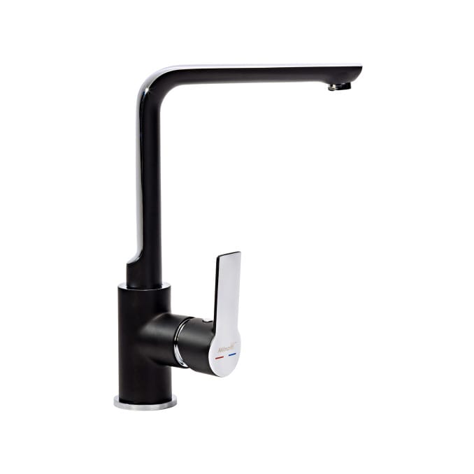 Moderna baterija crna-hrom, jako povoljna cena. Baterija za sudoperu sa 2 cevi – postavka na centralni bojler ili na nisko montažni bojler pod pritiskom. Pomična lula 180′. Garancija 5 godina