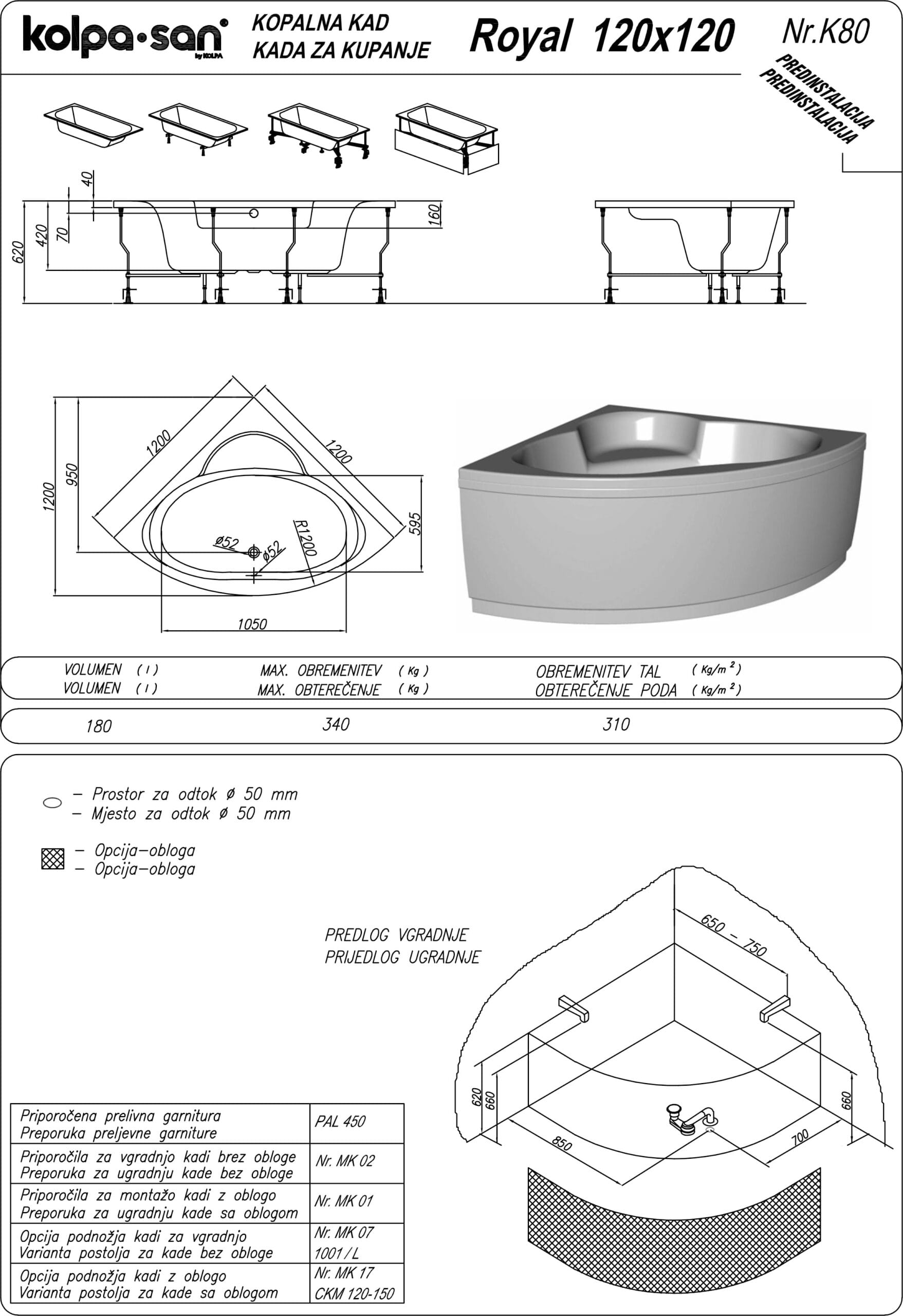 Kompletna Kolpa San Samostojeća ugaona akrilna kada Royal 120×120 – Vrhunski kvalitet Premium brenda sa garancijom od 10 godina. Ugaona Kada spremna za postavku na gotove podne pločice sa uračunatom metalnom konstrukcijom, oblogom i nogicama. Odliv-preliv (sifon) kade se kupuje posebno.