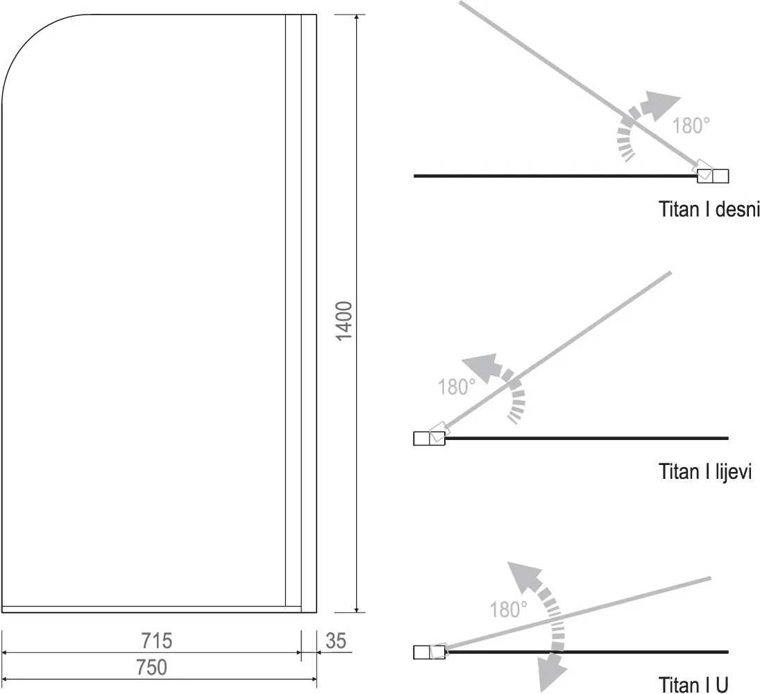 Dužina 75 cm, visina 140 cm. Jednodelno 6 mm kaljeno staklo sa AntiPlaque Nano zaštitom protiv taloženja kamenca. Univerzalna orijentacija – LEVA ili DESNA, otvaranje ka unutra, CRNI ram